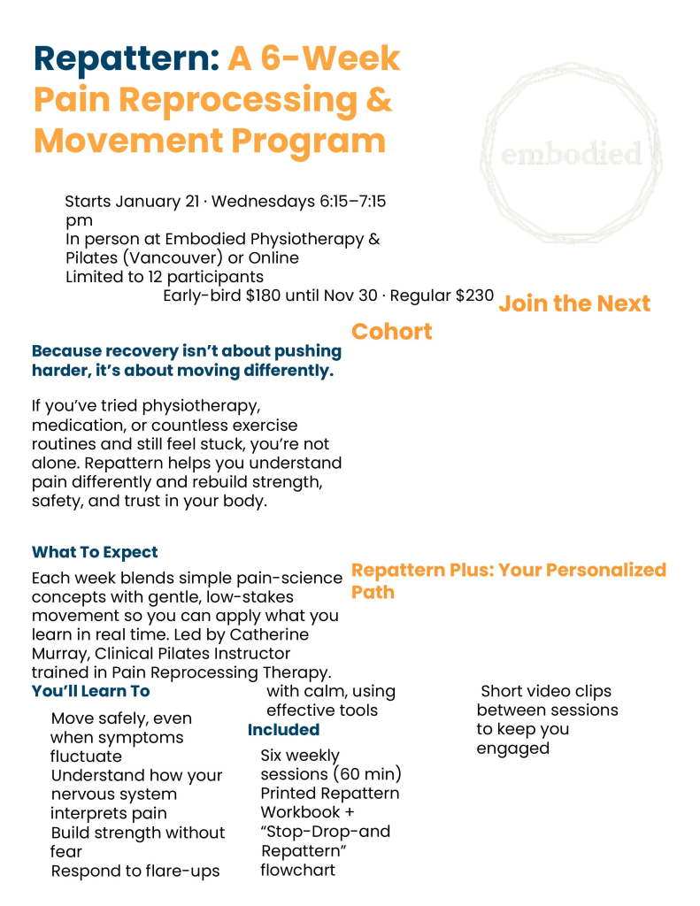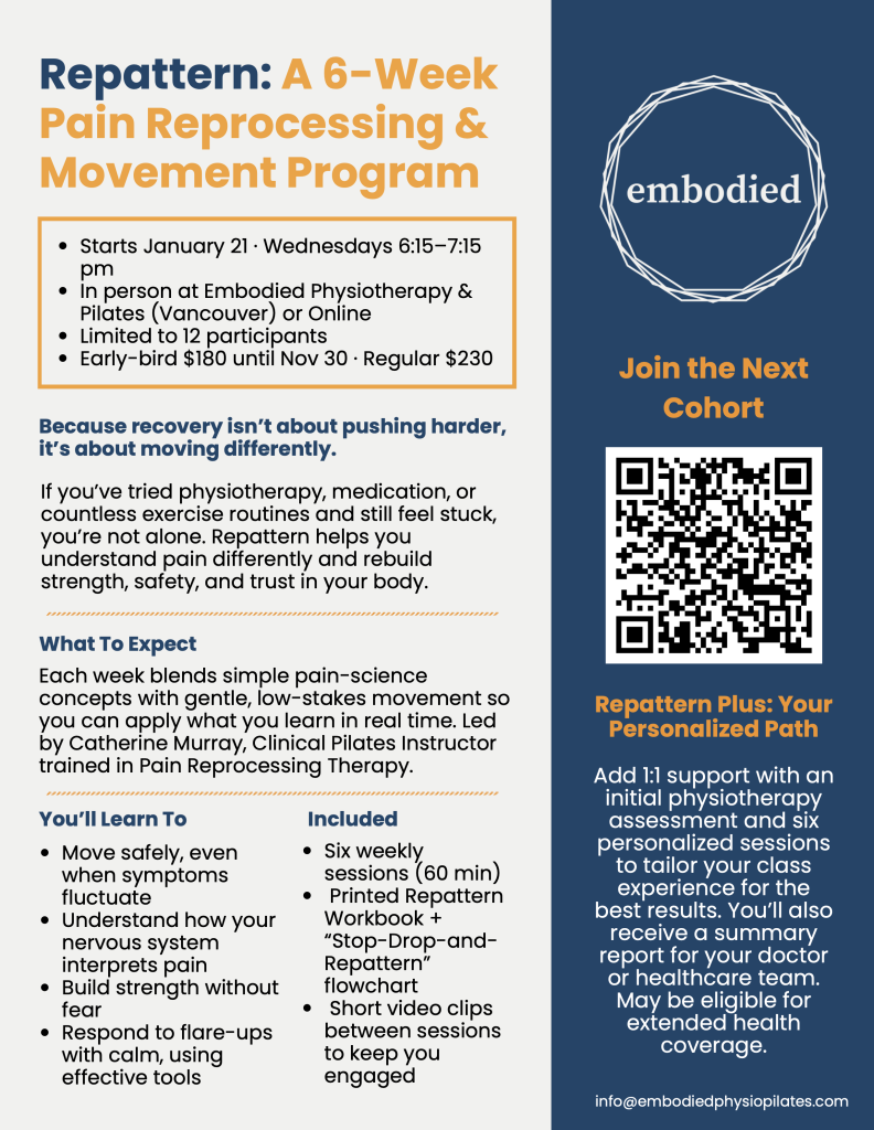 📧 To book Repattern Plus, email info@embodiedphysiopilates.com, or go to our Janeapp to see immediate availability for your intake session (additional times are available).